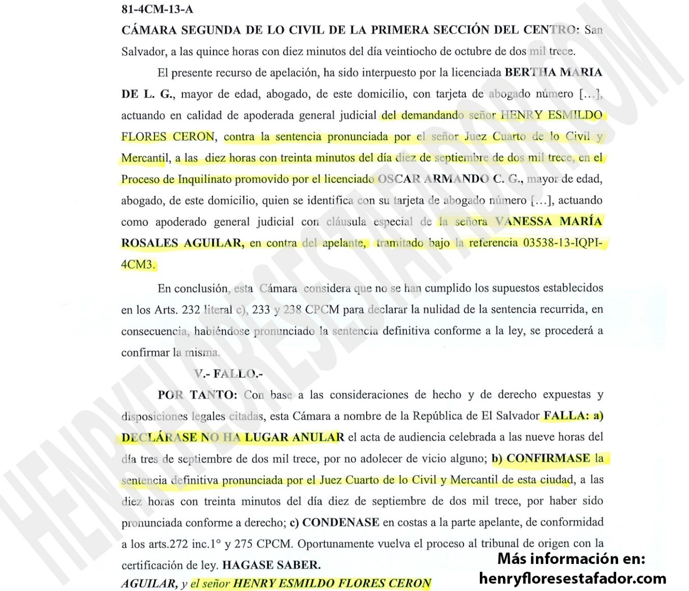 Aunque Henry Flores intentó presentar un recurso de apelación, la Cámara Segunda de lo Civil de la Primera Sección del Centro confirmó la sentencia definitiva; como se puede ver en el siguiente documento.