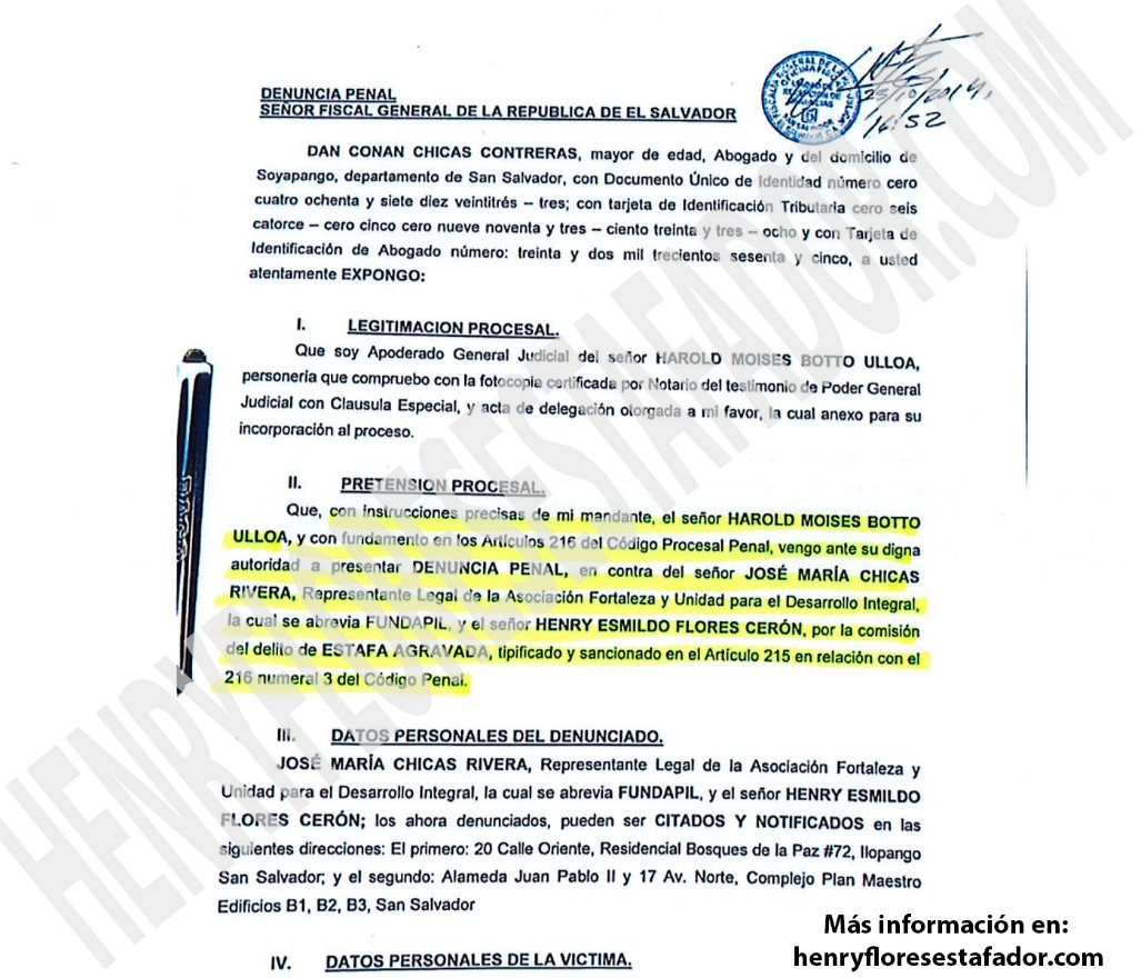 En 2019, se denuncia, penalmente, a Henry Flores, por el delito de Estafa Agravada. ¿La víctima? Su compañero de Nuevas Ideas, y candidato a Alcalde por el Antiguo Cuscatlán, Harold Moisés Botto.