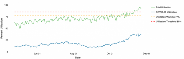 «Cuando se alcance el 85% de la capacidad, Utah estará funcionalmente sin camas de UCI con personal, lo que indica un sistema hospitalario abrumado», afirma el sitio web estatal sobre coronavirus.